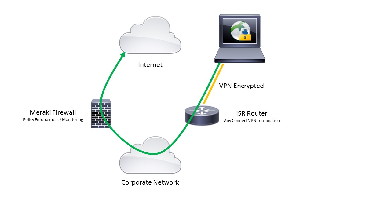 Any Connect is easy to deploy, it’s flexible and works on just about any client platform. In my design, I wanted to backhaul all Any Connect client traffic into the corporate network and then treat it with the same internet edge polies as corprate users. The Meraki MX series firewall is the source of policy enforcement so traffic will need to enter the network and then be routed through this device before going onto the wide open internet. The prior WAN routers where ISR G2’s so I decided to pull one of them off the shelf to stand in as the Any Connect termination point. An ISR is extremely flexible when it comes to routing tricks as well.