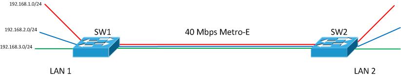 I don’t have the VLANs labeled in the diagram so let’s say Red is management in VLAN 100, blue is voice in VLAN 101 and green is data in VLAN 102. Like I indicated earlier each VLAN spans the WAN link. Also, SW1 is currently the default gateway for each VLAN. The internet router/firewall is not pictured but we would assume it is connected to SW1 as well.
