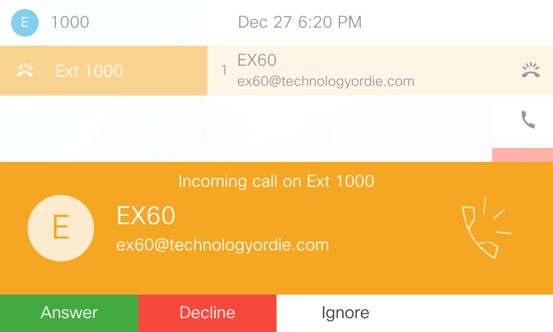 Lets look the default experience on a user’s 8865 IP phone when receiving a call from DN 1002 also identified by the SIP URI of EX60@technologyordie.com. Here you can see the default behavior, the DN of 1002 is shown.