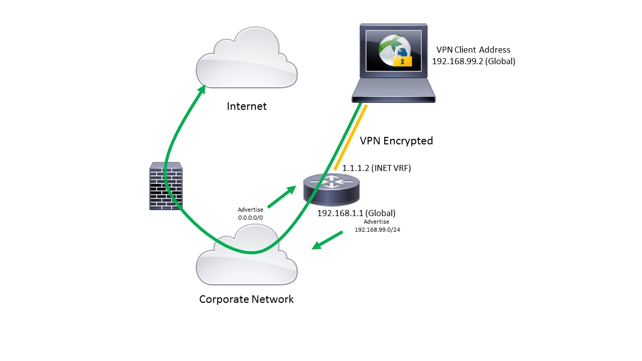 The 1.1.1.2 IP address lives in the INET VRF. A common term for this is a “front door VRF” because it’s the direct interface, or front door, to the internet. All remaining IP addresses will be configured or dynamically allocated within the global routing instance. Depending on your topology it is also very likely your router will need to be advertising routes for the VPN clients into your corporate network to ensure full round trip connectivity. The global routing process will also pick up a default route from the corporate network that will guide traffic through the Meraki firewall. This default route would have confliceted with the routers default route to the interned had we not used the VRF features.